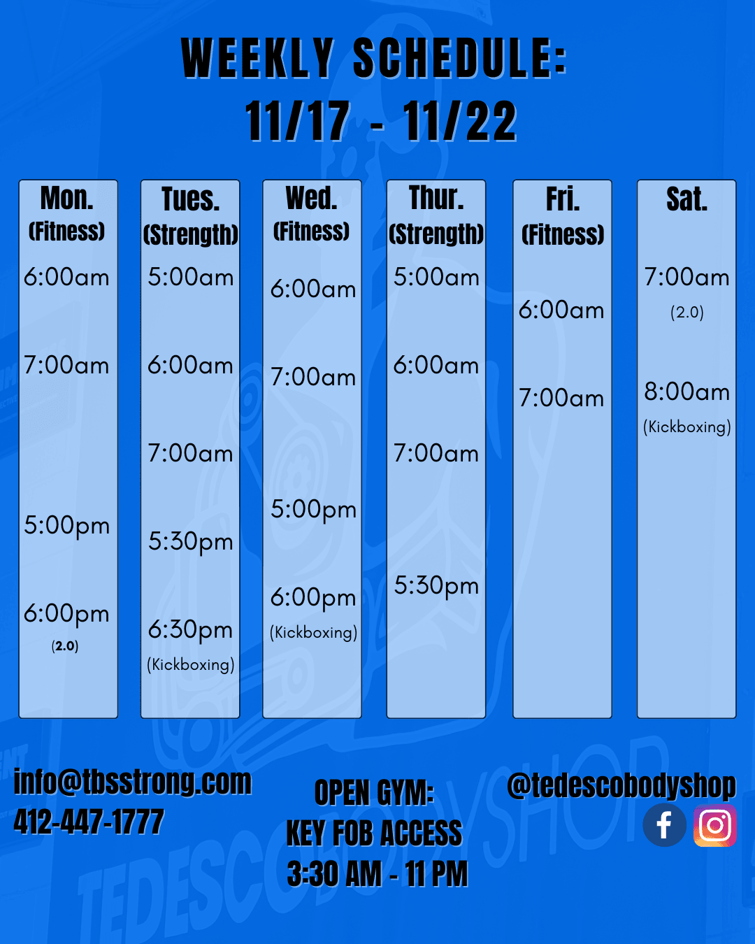 Most up to date schedules are posted to Facebook and Instagram every Sunday.
